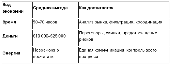 Результат: процесс, который обычно занимает 2–3 месяца самостоятельных поисков, превращается в целенаправленную и эффективную работу, завершающуюся за неделю.